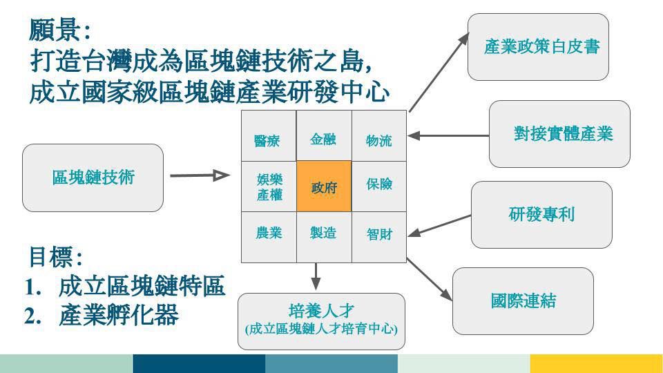这是许毓仁立委于质询国发会时用的PPT其中一页,可以看出至少在他心中,金融、医疗、物流、农业、制造、娱乐、智慧产权、保险、以及公共事务,等九个面向都与区块链脱离不了关系。