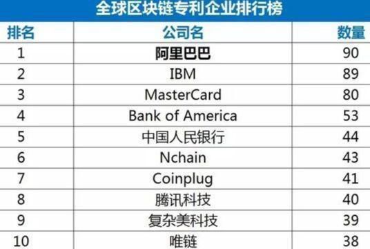 目前,阿里巴巴以90项专利数名列全球区块链专利第一名。